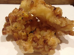 コーンのかき揚げを、醤油で焦がす